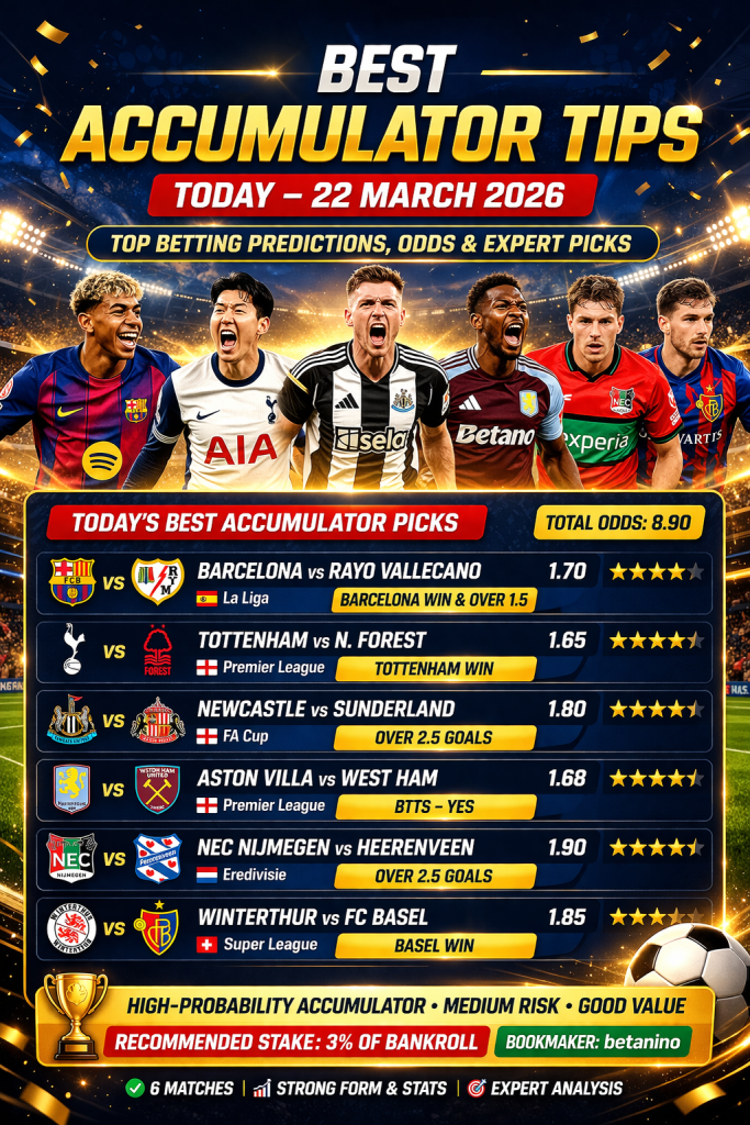 Todayโs best accumulator focuses on Barcelona dominance, Tottenham home strength, Newcastle goal potential and consistent BTTS trends in Villa vs West Ham and NEC vs Heerenveen. Baselโs superior quality completes a balanced coupon with strong probability. Total combined odds around 8.90 provide excellent value for medium-risk bettors seeking smart returns.